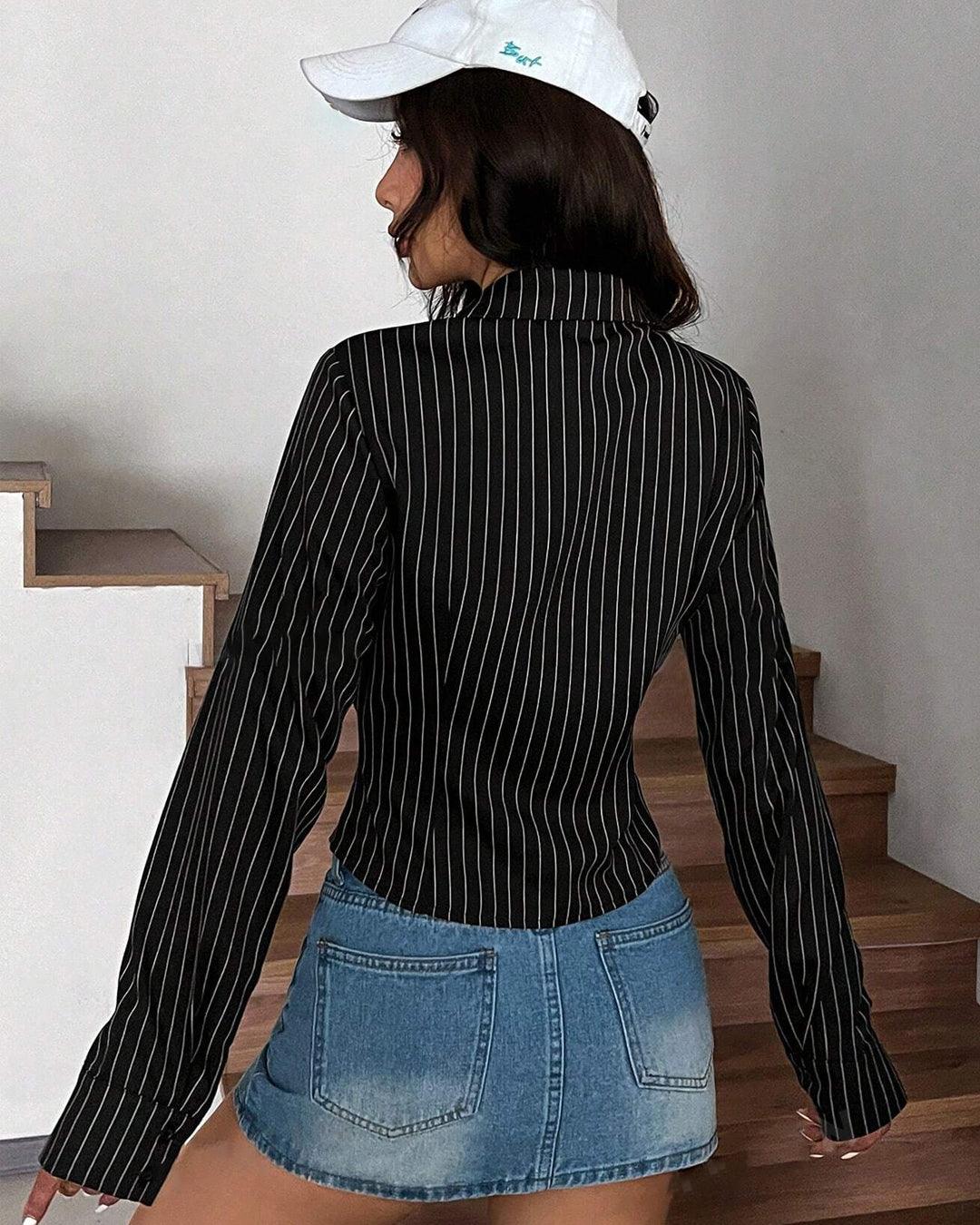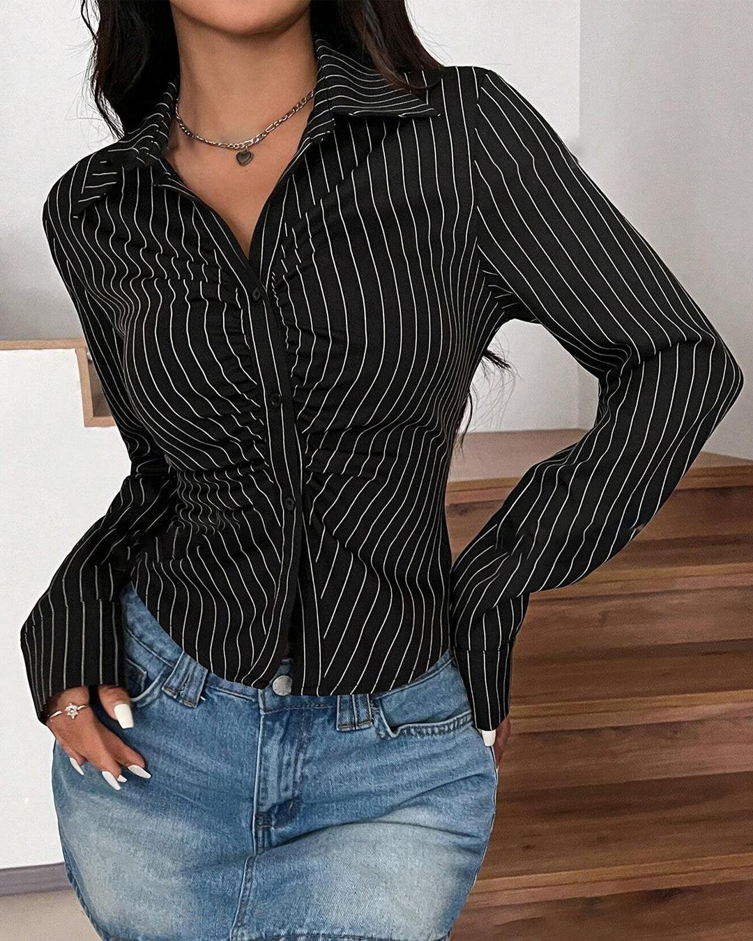 Striped Front Ruched Fitted Long Sleeve Shirt